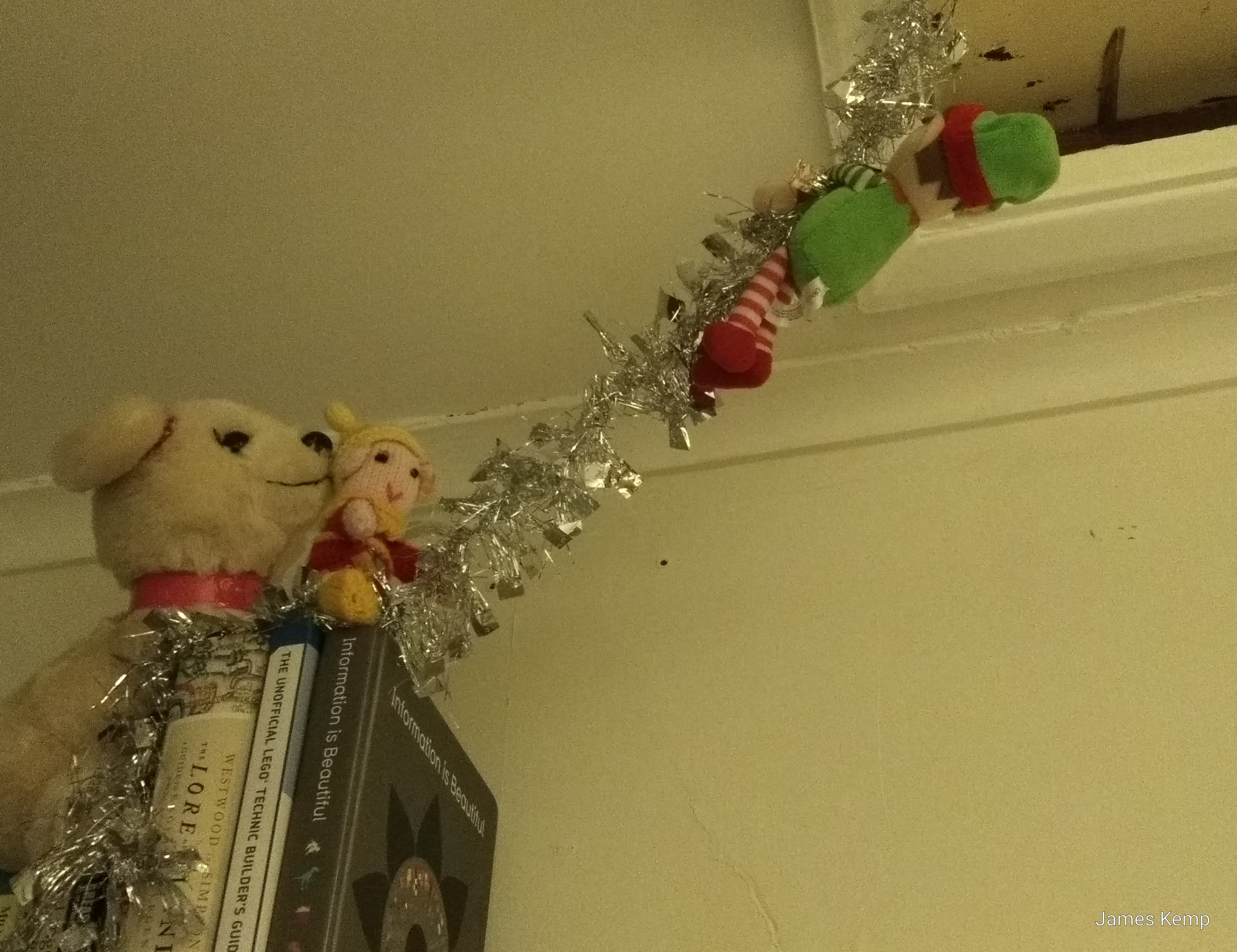 Timmy the elf wanted to make sure that the chimney was ready for Santa. So aided by Alfie and Barbie’s dog he’s climbed up the bookshelf and is making his way into the loft for an inspection….