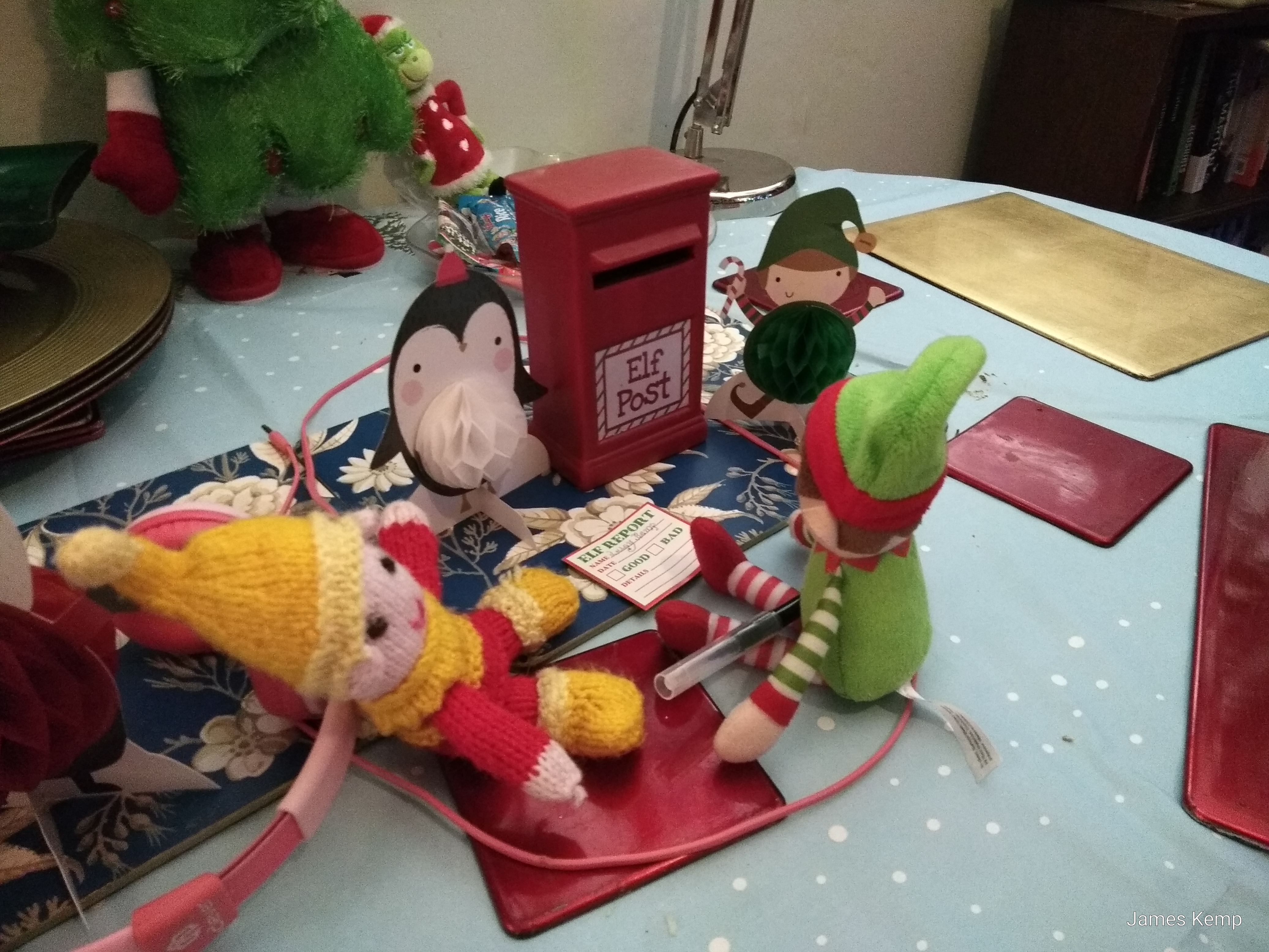 With a week to go the Elf Post Box has appeared. Each elf had a report card to send to Santa about the behaviour of Alex and Lucy. Here they are sitting on the dining table contemplating a good or bad report.